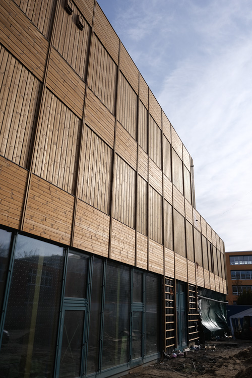 Die Eingangsfassade ist fast komplett montiert. Die Sporthalle wird eingerichtet.