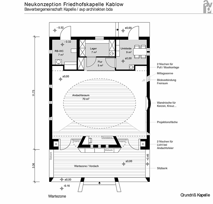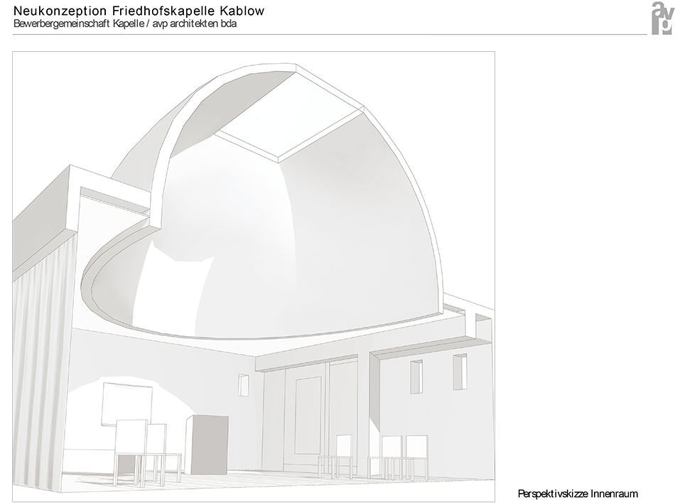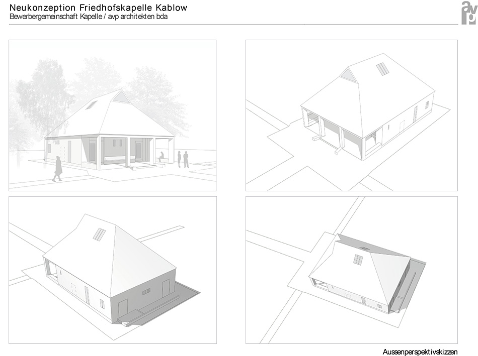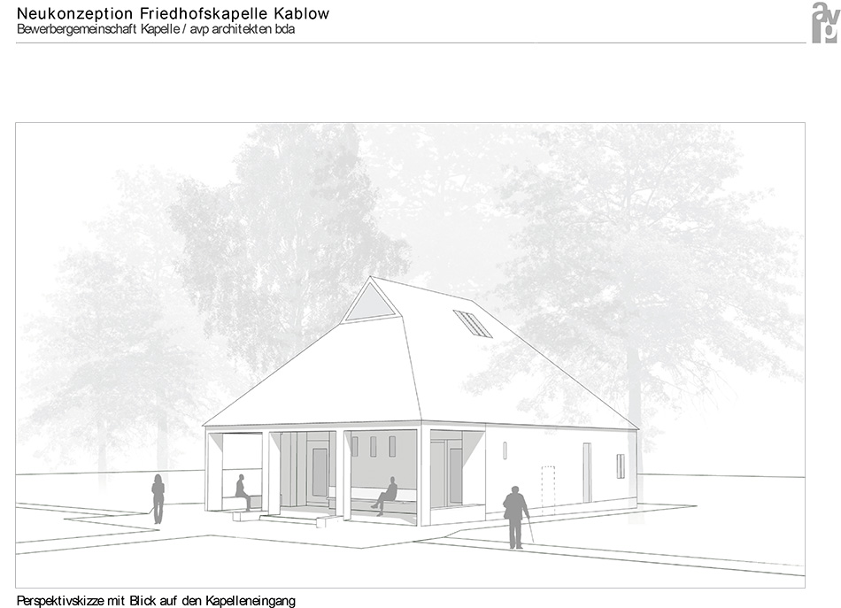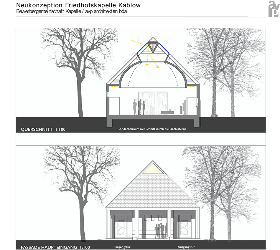 avp gewinnt den 2. Kapellenwettbewerb in Königs Wusterhausen. Die Beauftragung erfolgt im März 2022. Die Kapellen fügen sich jeweils in den Ort (Friedhof) ein und prägen diesen gleichzeitig auf unterschiedliche Weise. Das Zentrum/der Andachtsraum beider Kapellen ist so konzipiert, dass die Abschiedszeremonie auf individuelle Weise gestaltet werden kann.