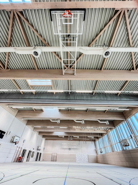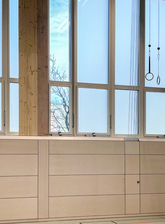 Die Eingangsfassade ist fast komplett montiert. Die Sporthalle wird eingerichtet.